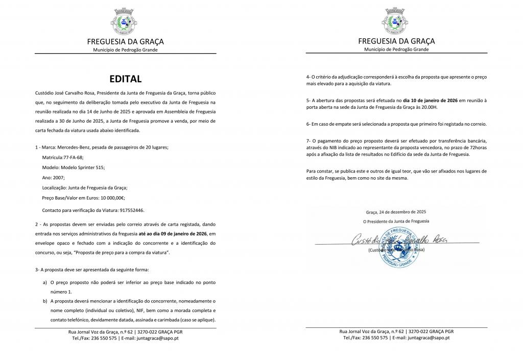 EDITAL VENDA DE CARRINHA - Matricula Matrícula 77-FA-68